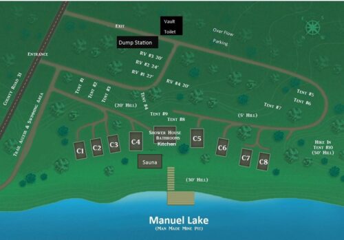 We are the only resort connecting the Cuyuna Rec Area to offer cabins on stilts. Have you ever wanted to feel like your sleeping in a tree house? Then these are the cabins for you with the cable walk bridge 7′ off the ground is a experience you won’t forget. All cabins come with a Fire Ring with a grate for cooking, park style charcoal grill, picnic table and 4 folding chairs for around the campfire. The cabins have a screen porch under them and a bike storage locker. (Note these cabins do move a bit so if your afraid of heights or movement these are not the cabins for you.) There is a max of 4 people per cabin, we understand if you have 3 or 4 children please call or email prior to making a reservation to inquire. Bring your own Bedding and Towels. Bedding And Towels Are only available in Cabins 4 & 5. Bring Your Own Pillows.